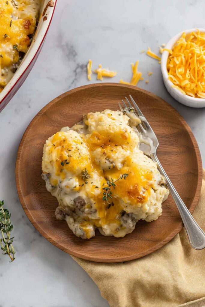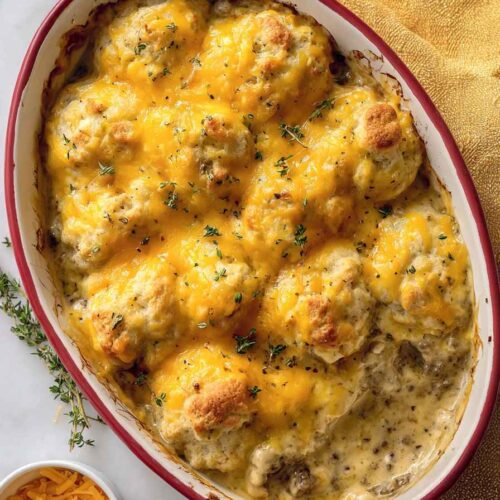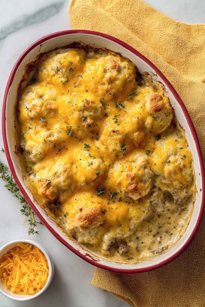 - All your breakfast favorites in one dish – This casserole combines fluffy biscuits, savory sausage gravy, scrambled eggs, and melted cheese into one satisfying pan that hits all the right notes.