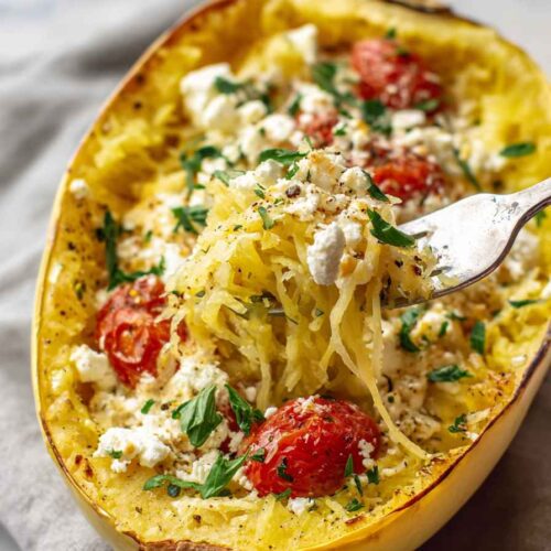 Refrigerate: This feta spaghetti squash keeps really well in the fridge for up to 4 days in an airtight container. I actually think it tastes even better the next day because all those Mediterranean flavors have more time to meld together.