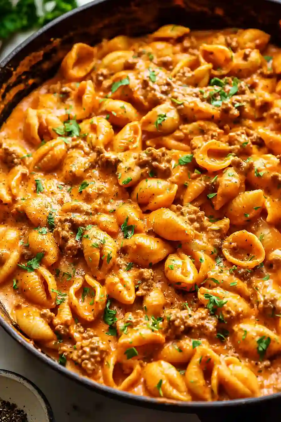 This one-pot wonder brings together tender ground beef and pasta shells in a rich, tomatoey sauce that the whole family will love. The shells catch all that beefy goodness in their little pockets, making every bite satisfying.