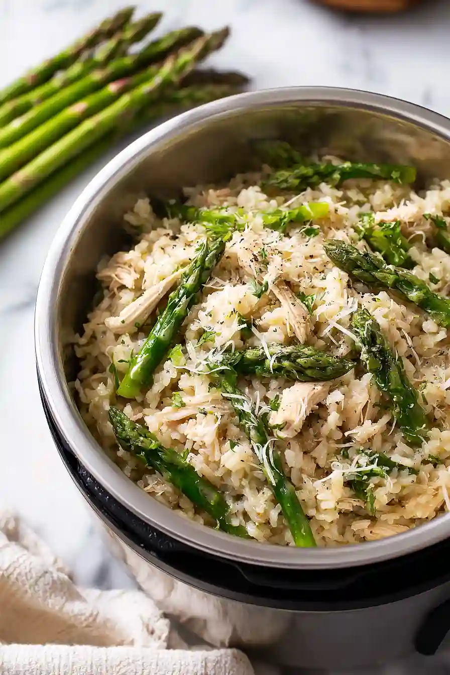 • Carefully open the pot and give everything a gentle stir. Add the cut asparagus pieces and freshly grated Parmesan cheese, stirring to distribute them evenly throughout the rice and chicken. I like to add the lemon juice at this point because the acidity brightens the flavors and cuts through the richness of the cheese and butter. Cover the pot (you don't need to seal it) and let it sit for 2-3 minutes so the asparagus steams and becomes tender while the cheese melts into the rice.