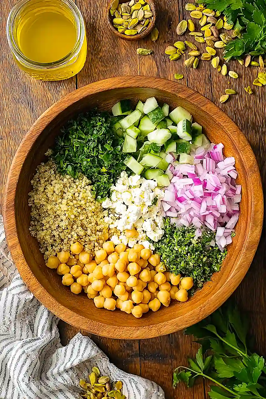 - While the quinoa is chilling, prepare the vegetables and herbs. Dice the English cucumber and mince the red onion, parsley, and mint leaves. Roughly chop the roasted salted pistachios, and crumble the feta cheese if not already crumbled. Rinse and drain the garbanzo beans. Having all your ingredients prepped and ready makes assembling the salad a breeze!