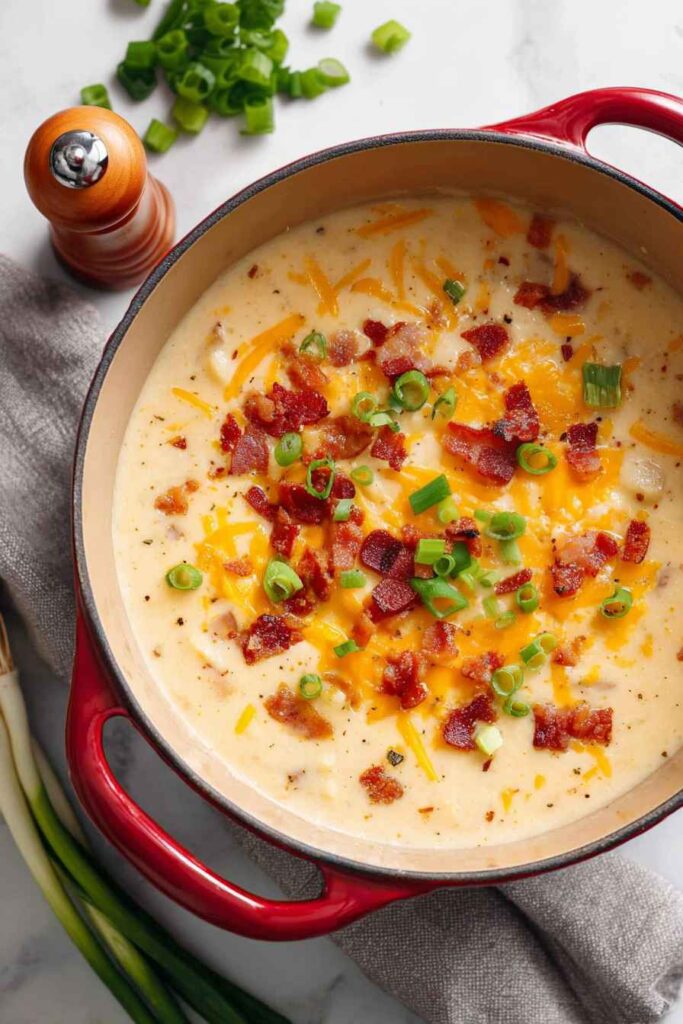 - Ladle the soup into bowls. Top each serving with the reserved crispy bacon, extra grated cheddar cheese, and chopped green onions (scallions). Serve hot and enjoy!