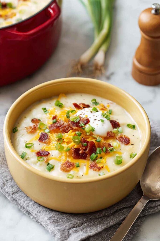 For a chunkier soup, mash only a small portion of the potatoes or leave them whole. To make it a bit lighter, use 2% milk instead of whole and reduce the sour cream slightly—just keep in mind it will be less rich and creamy. If the soup ever gets too thick, simply whisk in a bit more warm milk or chicken broth until it reaches your preferred consistency.