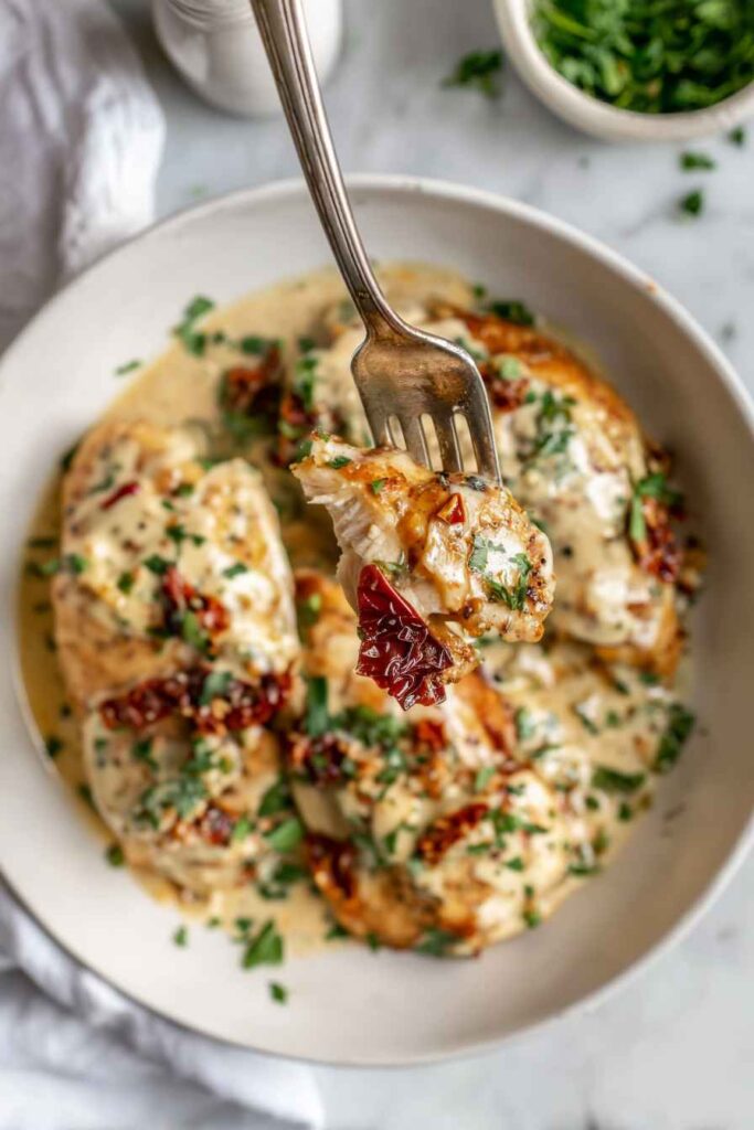 - Serve the creamy sun-dried tomato chicken hot over rice, noodles, or mashed potatoes as you prefer. Spoon plenty of sauce over the chicken and garnish with additional herbs if desired. Enjoy your meal!