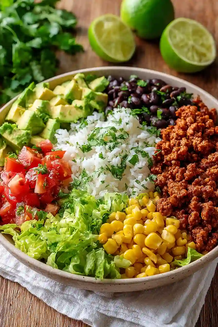 - Divide the lime-cilantro rice from Step 6 among serving bowls as the base. Top each bowl with the seasoned turkey mixture from Step 4, then add a generous portion of the bean and corn mixture from Step 5. Arrange the shredded romaine lettuce around the bowl, then add sliced avocado, red onion, pico de gallo, and green onion on top. I like to add all my toppings just before eating so the lettuce stays crisp and the avocado doesn't brown.