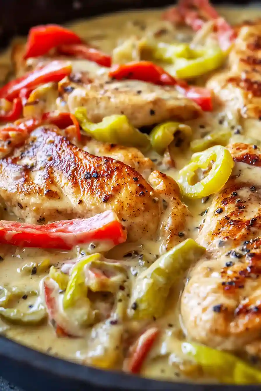 - Creamy, tangy flavor – The pepperoncini peppers add a mild, tangy kick that perfectly balances the rich cream sauce, making every bite interesting without being too spicy.