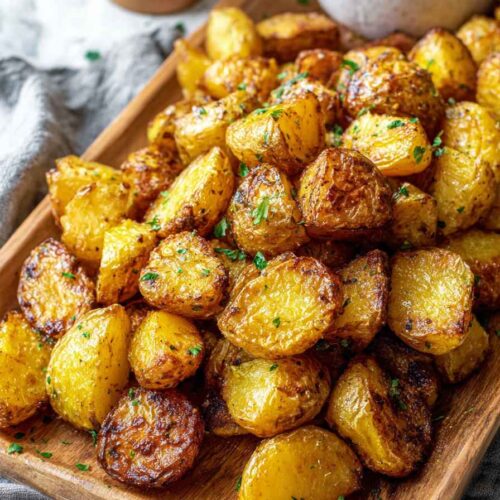 Once the potatoes are perfectly golden and crispy, remove them from the oven. Drizzle the warm garlic butter generously over the roasted potatoes and toss gently to coat. Serve immediately as a delicious side dish. Enjoy!